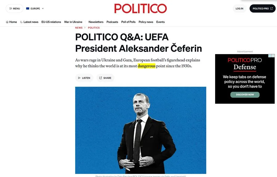 Aleksander Čeferin je v intervjuju za Politico odkrito spregovoril o vlogi nogometa v politično nabitem svetu. Do političnih voditeljev je bil zelo kritičen: »Kdor misli, da je ‘Stop killing children, stop killing civilians’ politično sporočilo, je zame idiot,« je dejal ob vprašanju o transparentu na Superpokalu, kjer je UEFA obsodila nasilje nad civilisti v Gazi. Poudaril je, da šport ne more rešiti vojn, a mora jasno zavzeti stališče, ko gre za človečnost.