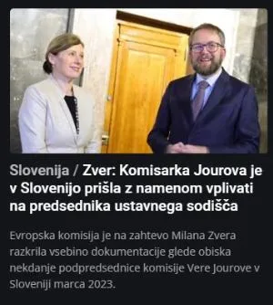 Drugi je škandalozno razkritje, da je evropska komisarka Vera Jourova slovensko ustavno sodišče dejansko obiskala z namenom vplivanja na konkretno zadevo – ustavno presojo Zakona o RTV Slovenija, čeprav so to javno zanikali tako na ustavnem sodišču kot ona sama. Milan Zver je po dveh letih pravdanja razgalil veliko prikrivanje, ki bi pod neko drugo oblastjo in drugo barvo evropske komisarke ter kompromitiranega predsednika ustavnega sodišča odjeknila kot atomska bomba – mediji bi zahtevali kri in glave vseh vpletenih, zdaj pa se ni zgodilo nič – dobesedno. Karikatura tega »niča« je mimobežna novica na MMC RTV Slovenija z naslovom, ki vsebino razkritja polaga v usta Milanu Zveru, ne pa dokumentu, v katerem je zapisana.
