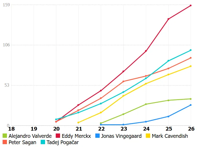 Pogačar ima največ kariernih zmag med aktivnimi kolesarji, sicer pa je rekorder z 279 kariernimi zmagami Eddy Merckx. Pogačar je trenutno na večni lestvici na 25. mestu.