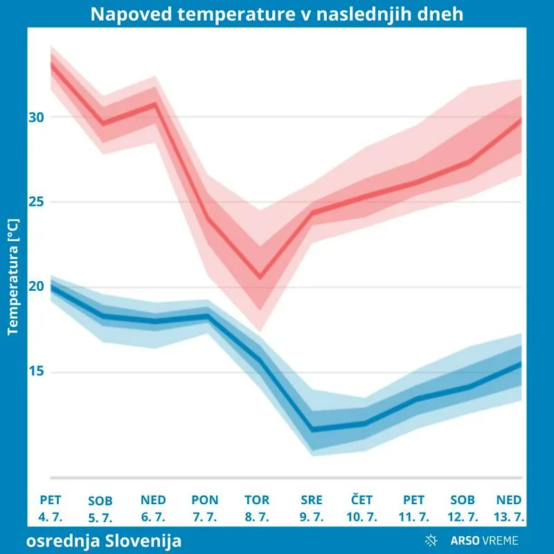 V noči na ponedeljek pa bo Slovenijo dosegla izrazita vremenska fronta, ki bo prinesla oblačno vreme, pogoste padavine in ohladitev. V ponedeljek in torek bodo temperature padle, v torek ponekod pod 20 °C, skupna količina dežja pa bo med 30 in 60 mm. Od srede se obeta suho in razmeroma sveže vreme, meteorologi pa napovedujejo, da bi lahko teden med 7. in 13. julijem postal najhladnejši teden tega poletja.