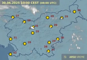 Danes bo povečini sončno in vroče. Najvišje dnevne temperature bodo od 31 do 36 °C. Proti večeru se bo oblačnost povečala, nastalo bo nekaj neviht, ki se bodo ponekod nadaljevale v noč na torek.