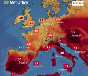 Danes bo vročinski val dosegel svoj vrhunec, saj se bodo temperature v vzhodni in osrednji Sloveniji povzpele vse do 37 stopinj Celzija. Že zjutraj so bile temperature visoke, kar pomeni močno toplotno obremenitev za prebivalstvo. Vremenoslovci opozarjajo, da naj se ljudje čim bolj izogibajo fizičnim naporom na prostem, saj lahko visoke temperature negativno vplivajo na zdravje. Povišane bodo tudi vrednosti ozona, ki lahko dražijo dihala, zato naj osebe z boleznimi dihal in krvnega obtoka ostanejo v zaprtih prostorih.