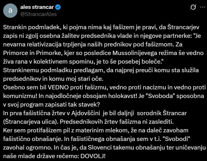 Štrancar se je medtem odzval na očitek podmladka Svobode, češ da relativizira fašizem: