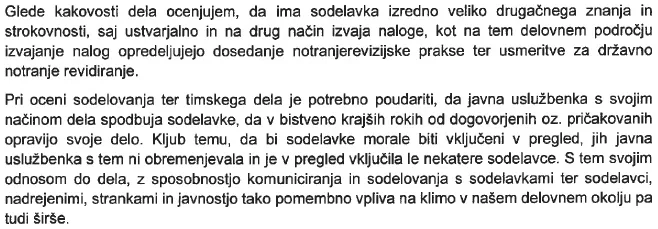 Ocenjevalni list, ki ga 13. marca letos podpiše ministrica Katič osebno, je tudi sicer poln podobno nenavadnih opazk na račun dela notranje revizorke Hötzl. Na primer, da “ustvarjalno in na drug način izvaja naloge, kot na tem delovnem področju (…) opredeljujejo dosedanje (..) prakse ter usmeritve”. Ali pa, da “s tem svojim odnosom do dela (…) pomembno vpliva na klimo v našem delovnem okolju pa tudi širše”.