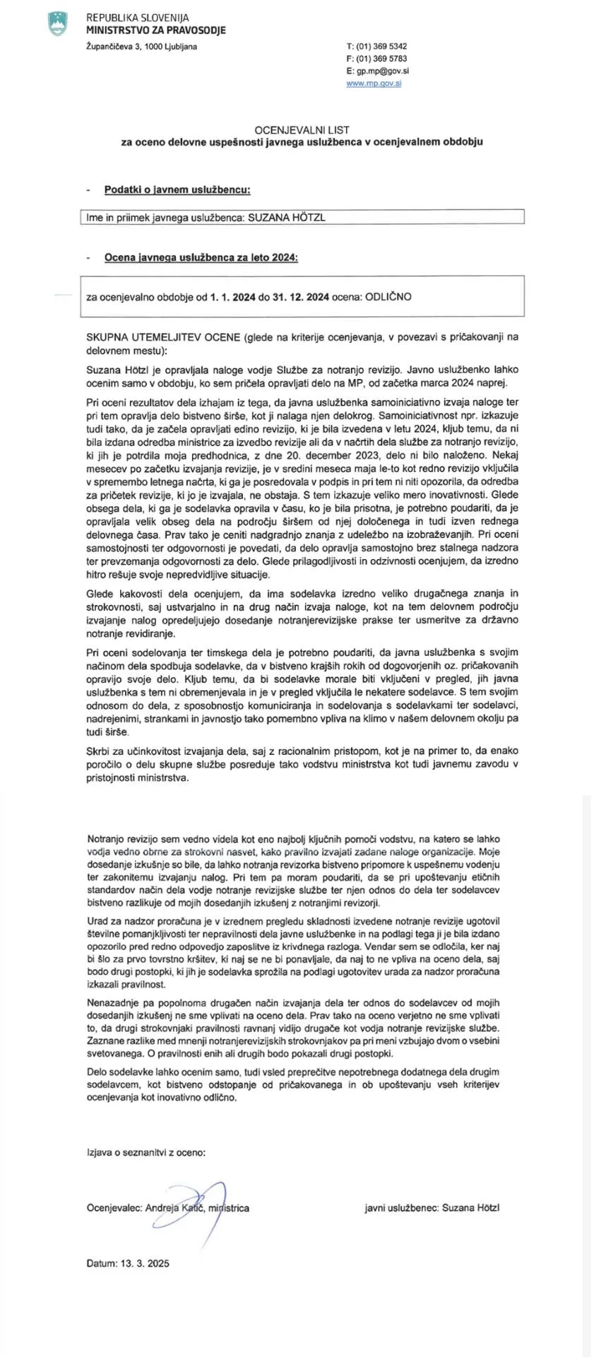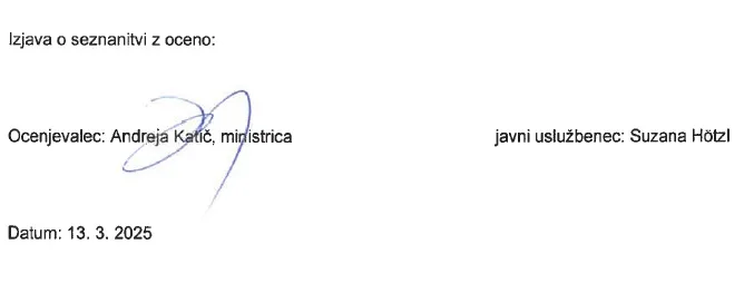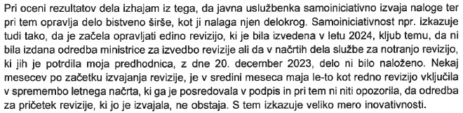 Takole se bere morda še najbolj nenavaden del obrazložitve ocene javne uslužbenke Suzane Hötzl za leto 2024, v katerem ministrica Andreja Katič ugotavlja, da uradnica “izkazuje samoiniciativnost” in “veliko mero inovativnosti”. Saj da “opravlja delo bistveno širše, kot ji nalaga njen delokrog. Tudi tako, da je začela opravljati (…) revizijo (…) kljub temu, da ni bila izdana odredba ministrice za izvedbo revizije ali da v načrtih dela (…) delo ni bilo naloženo”.