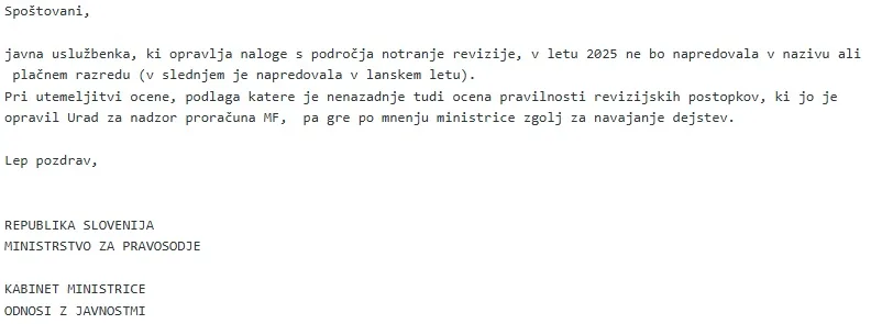 Z ministrstva za pravosodje smo prejeli skop odgovor, ki pa razkriva, da so notranji revizorki lani, kljub grožnji s krivdno odpovedjo, celo povišali plačni razred.