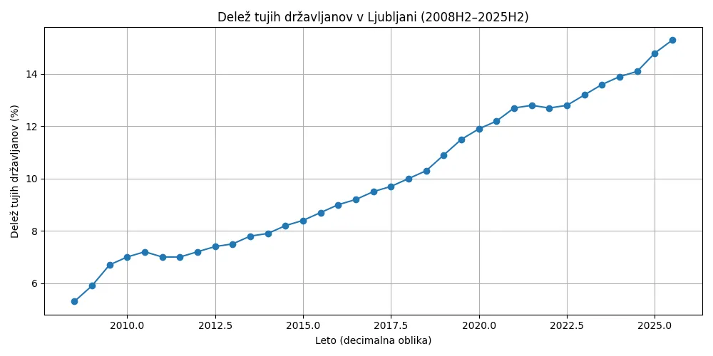 Analiza podatkov Statističnega urada razkriva, da se je delež tujih državljanov v Ljubljani v zadnjih 17 letih res močno povečal. Leta 2008 je bilo v Mestni občini Ljubljana 14.590 tujih državljanov, kar je predstavljalo 5,3 % vseh prebivalcev. Do sredine leta 2025 se je število dvignilo na 45.983 oseb in delež na 15,3 %. Spodnji graf prikazuje trend od leta 2008 (drugo polletje) do leta 2025 (drugo polletje).