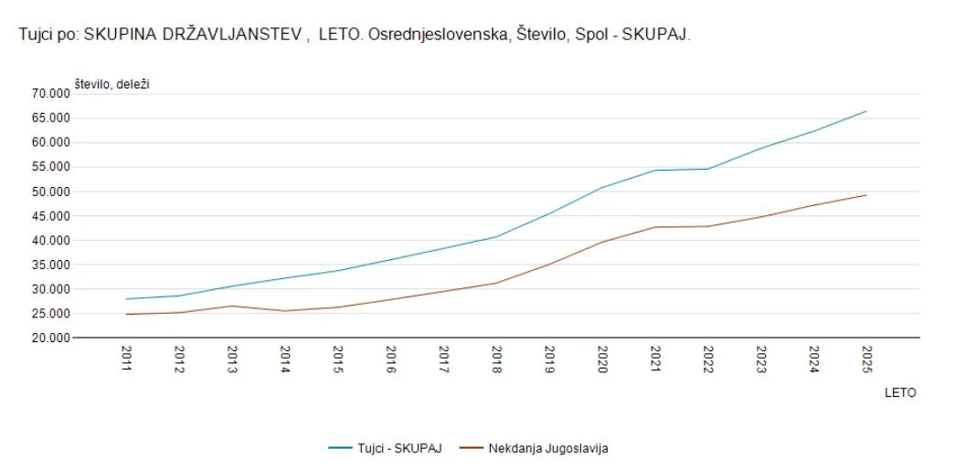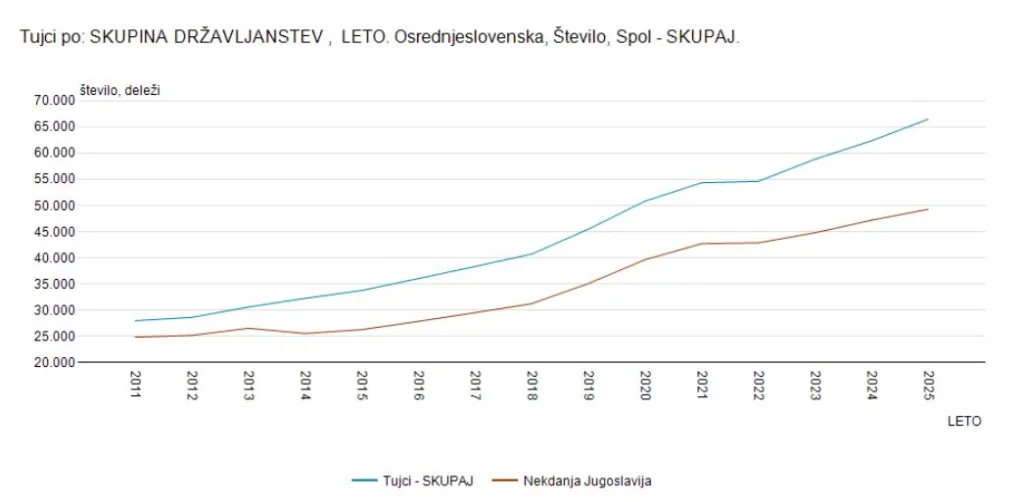 A postavimo kontekst. V Sloveniji je leta 2011 živelo 72.595 ljudi z državljanstvom naših bivših “bratskih republik”, danes pa jih tukaj živi kar 165.945. Vseh tujcev je v Sloveniji 215 tisoč, delež teh iz nekdanje Jugoslavije pa postopoma pada iz 87,7 % leta 2011 do 77,1 % leta 2025.