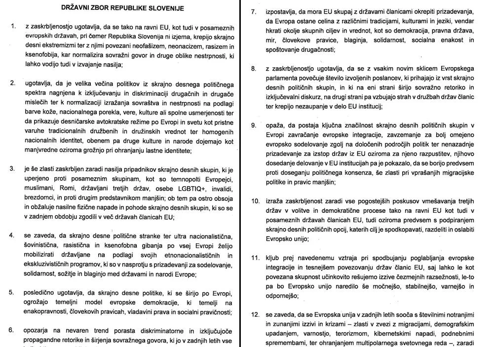 Medtem ko so ZDA med teroristične organizacije uvrstile skrajno levičarsko organizacijo Antifa, podobno pa razmišljajo tudi nekatere evropske države, je slovenski državni zbor danes s 45 glasovi za in sedmimi proti sprejel deklaracijo o vzponu skrajne desnice v Evropi z naslovom Nikoli več. Ta kot nevaren trend izpostavlja krepitve ekstremističnih desnih strank in gibanj ter predlaga ukrepe za omejitev njihovega širjenja. Na glasovanju je bilo navzočih 62 poslancev, med njimi pa ni bilo predstavnikov opozicijske SDS, ki se razprave niso udeležili.