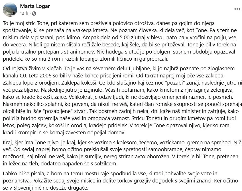 Že tretji dan mineva od brutalnega napada, po pričevanju s strani treh mladih Romov, na 72-letnega kmeta z Ježice v Ljubljani, ki je delal na njivi. On je sadil krompir, Romi so ga izkopavali, seveda ne kmetu v pomoč, če karikiramo širši kontekst situacije. In ker se očitno s tovrstnim “poslovnim razmerjem” ni strinjal, si je zaslužil batine.
