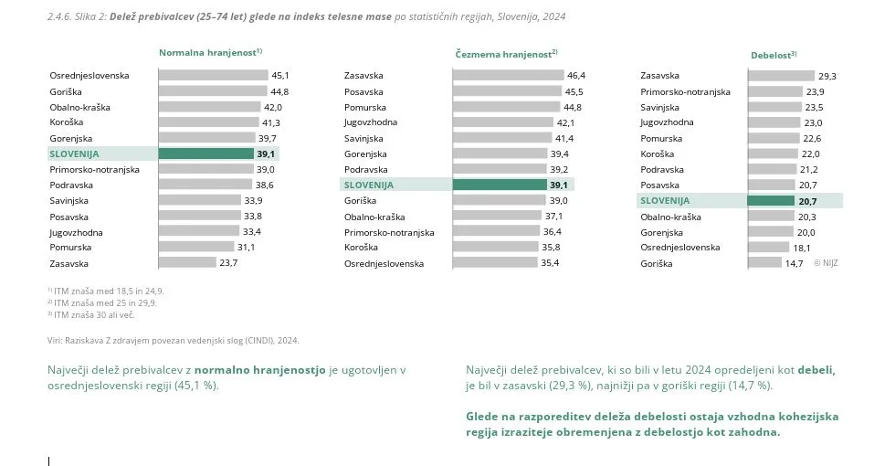 Zanimivo je tudi razmerje med čezmerno hranjenostjo in debelostjo: po podatkih NIJZ delež čezmerno hranjenih odraslih od leta 2012 na ravni države ostaja razmeroma stabilen, medtem ko delež debelih narašča (z 15,4 odstotka leta 2012 na 20,7 odstotka leta 2024). To nakazuje, da se del prebivalstva iz območja čezmerne hranjenosti postopoma pomika v debelost.