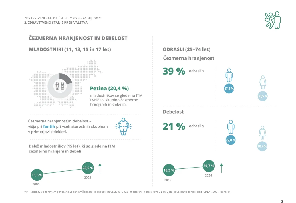 Po podatkih NIJZ, ki prehranjenost odraslih spremlja z indeksom telesne mase (ITM), je imelo leta 2024 v Sloveniji 39 % odraslih normalno telesno maso, 39 % čezmerno telesno maso in 21 % debelost, kar pomeni, da je imel skoraj vsak šesti od desetih odraslih ITM nad 25. Tudi pri mladostnikih slika ni bistveno boljša: med slovenskimi 15-letniki jih je s čezmerno telesno maso ali debelostjo 31 % fantov in 18 % deklet, kar kaže, da je problem izrazit že pred odraslostjo. Tudi med državami EU slovenski mladostniki zasedajo zaskrbljujoče 4. mesto po deležu 15-letnikov s čezmerno telesno maso ali debelostjo.