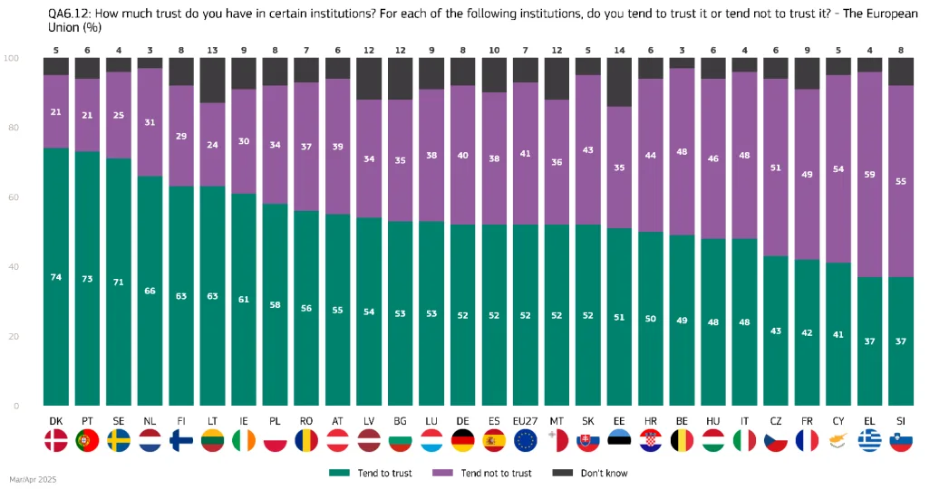 Slovenija pa je med petimi državami, kjer večina anketirancev ne zaupa EU: Grčija (59 % ne zaupa), Slovenija (55 %), Ciper (54 %), Češka (51 %) in Francija (49 %). Med vsemi državami je tistih, ki zaupajo Evropski uniji, v Sloveniji najmanj (skupaj z Grčijo).