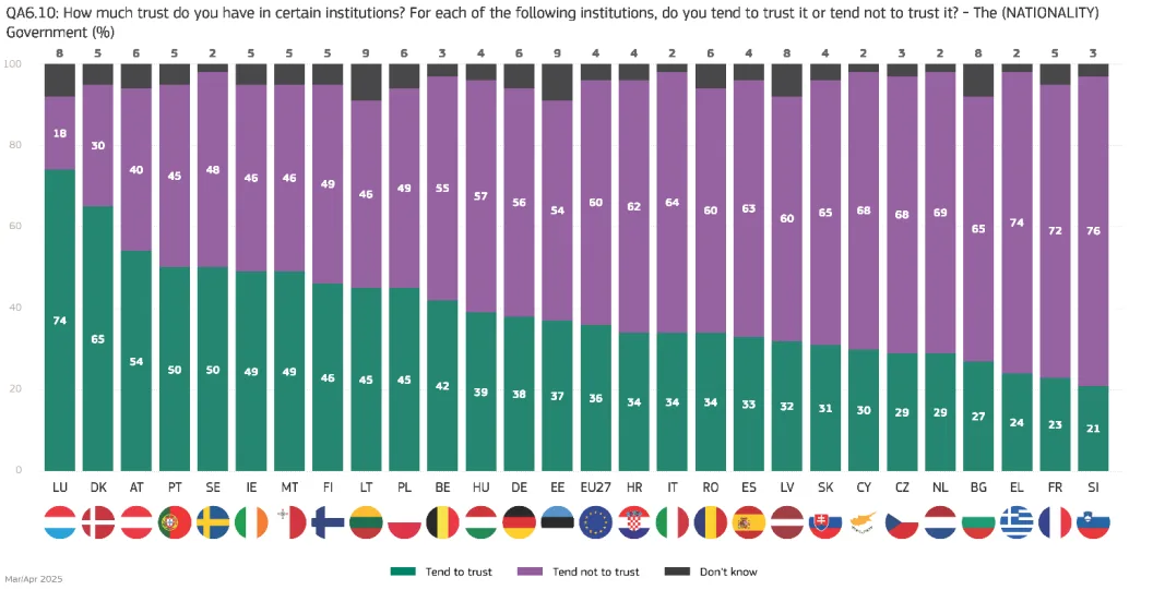 Na drugem koncu lestvice večina anketirancev ne zaupa svoji nacionalni vladi v 20 državah, najvišje ravni nezaupanja pa so v Sloveniji (76 %), Grčiji (74 %) in Franciji (72 %). Ponovno je Slovenija na zadnjem mestu (tokrat sama), ko gre za delež tistih, ki lastni vladi zaupajo.