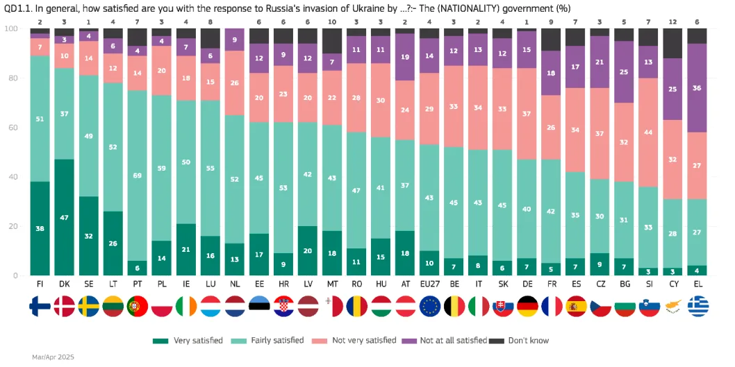 Medtem ko je večina državljanov EU zadovoljna z odzivom EU (54 %) ter svojih vlad (53 %) na rusko invazijo Ukrajine, Slovenija tu izrazito odstopa (36 % ter 34 %).