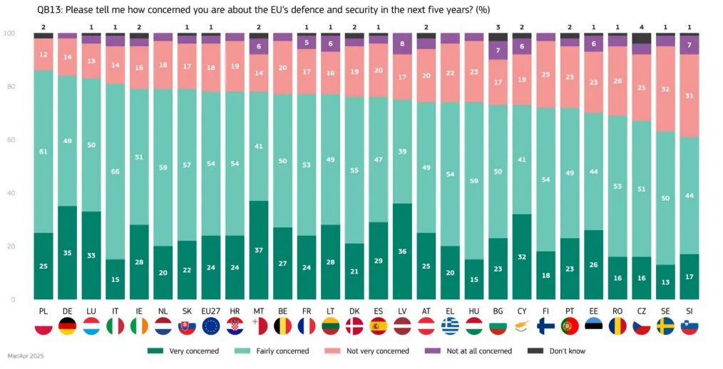 Skoraj štirje od petih državljanov EU (78 %) so zaskrbljeni glede obrambe in varnosti EU v naslednjih petih letih, vključno s 24 %, ki pravijo, da so “zelo zaskrbljeni”.