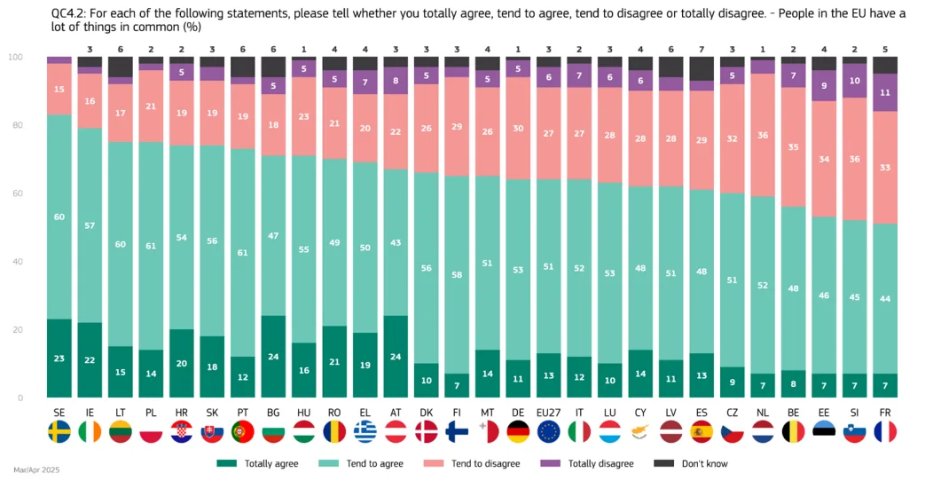 Slovenija podobno izstopa tudi pri vprašanju, ali imajo ljudje v EU veliko skupnega. S to trditvijo se strinja večina anketirancev v vseh državah članicah, pri čemer se tako strinja več kot tri četrtine anketirancev na Švedskem (83 %) in Irskem (79 %) – v primerjavi z nekaj več kot polovico anketirancev v Estoniji (53 %), Sloveniji (52 %) in Franciji (51 %).