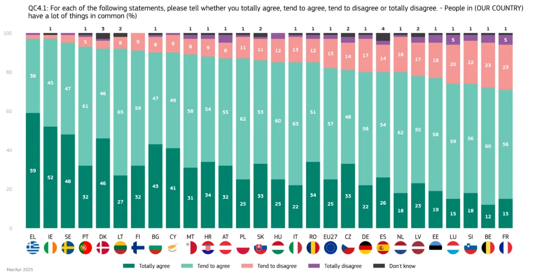 V vsaki državi članici več kot sedem od desetih anketirancev meni, da imajo ljudje v njihovi državi veliko skupnega, najbolj v Grčiji in na Irskem (vsaka po 97 %), pa tudi na Švedskem (95 %), Portugalskem (93 %), Danski in Litvi (vsaka po 92 %) ter Finskem (91 %).