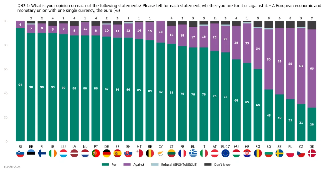 Podpora evropski ekonomski in monetarni uniji z enotno valuto, evrom, ostaja visoka v veliki večini držav: v 22 državah članicah (nespremenjeno od jeseni 2024) večina anketirancev podpira takšno unijo, najbolj izrazito v Sloveniji (94 %), pa tudi na Irskem, v Estoniji in na Finskem (vsaka po 90 %).