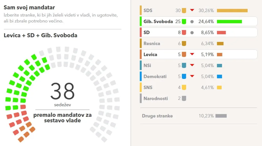 Če anketne rezultate preslikamo na sedeže državnega zbora (kar omogoča stran volilna-napoved.si), bi to pomenilo 30 sedežev za SDS (+2). 25 sedežev za Svobodo (+5), 8 sedežev za SD (+2), 6 sedežev za Resni.co (+2), 5 sedežev za Levico (+1), prav toliko za NSi (-2) in Demokrate (+1) ter 4 za SNS (+4).