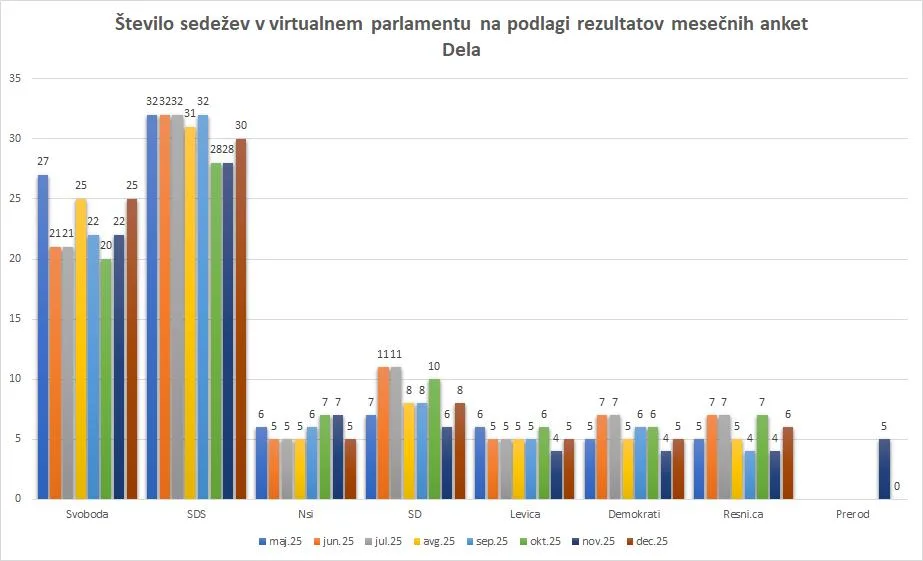 Obstoječa koalicija bi po tej meritvi Dela dobila 38 poslanskih sedežev, oziroma kar 5 več kot novembra. Obstoječi opozicijski trojček bi jih osvojil 40, kar je še vedno 1 več kot novembra. Glede na mesec poprej bi namreč izpadli Prerod (prej 5). Piratska stranka in Vesna (po 4).