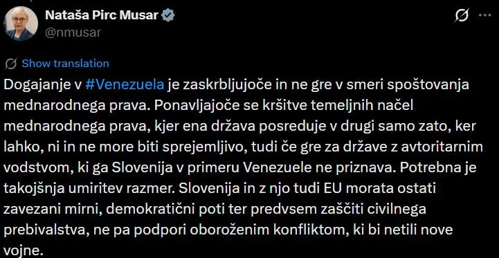 - Predsednica EK Ursula von der Leyen je zapisala, da zelo natančno spremlja situacijo v Venezuleli. “Podpiramo venezuelsko ljudstvo in mirno ter demokratično tranzicijo države. Vsaka rešitev mora spoštovati mednarodno pravo in Ustavno listino ZN.”