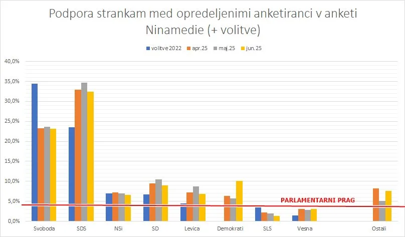 Če bi bile volitve minulo nedeljo, bi med vsemi vprašanimi v anketi Ninamedie 25,3 % volilo SDS, 18,1 % Gibanje Svoboda in 7,9 % Demokrate Anžeta Logarja. Parlamentarni prag bi presegle še SD s 7 % podpore, NSi s 5,1 % in Levica s 5,3 % podporo. Vesna bi dobila 2,4 %, SLS 1,1 %, druge stranke pa skupaj 5,9 %, med njimi največ Resni.ca. Neopredeljenih je slaba petina vprašanih.