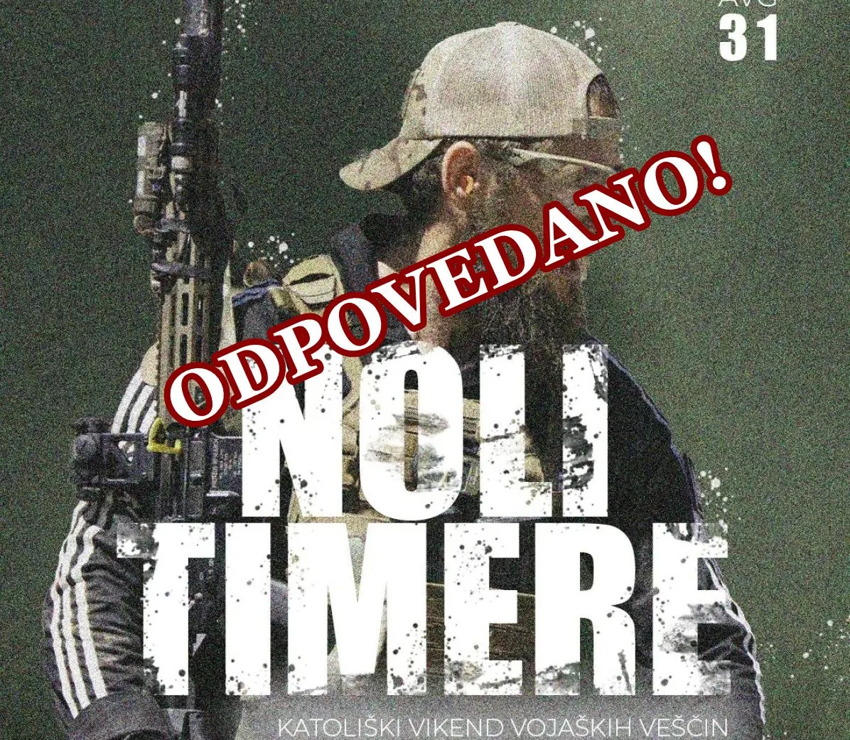 Katoliška mladina je tik pred zdajci odpovedala napovedani »katoliški vikend vojaških veščin« z geslom Noli timere (“Ne boj se”). Tabor, ki bi se moral ta konec tedna odviti v gozdovih pri Škofljici, je bil predstavljen kot tridnevna kombinacija duhovnosti, discipline in praktičnih znanj. A prav vojaški okvir je sprožil plaz odzivov, kritik, predvsem pa zakulisnih pritiskov z vseh strani, ki so dogodek na koncu tudi pokopali.