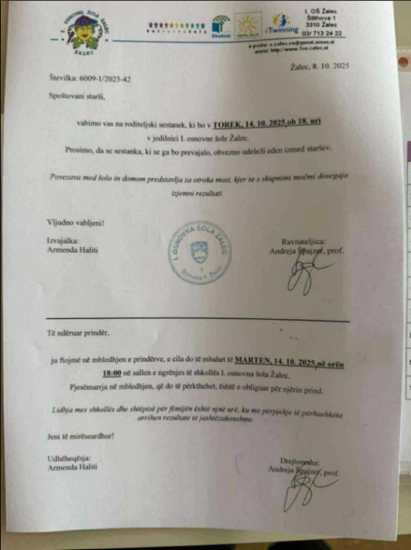 Za pojasnila smo se obrnili na vodstvo I. Osnovne šole Žalec. Kot pravijo, so v šoli organizirali tri roditeljske sestanke v mesecu septembru, katerih vabila so bila napisana v slovenščini. Ker so v šoli opazili, da se veliko staršev priseljencev ni udeležilo roditeljskih sestankov, kjer so bile podane pomembne informacije glede zagotavljanja varnega in spodbudnega učnega okolja, so organizirali dodaten roditeljski sestanek za starše priseljencev v mesecu oktobru.